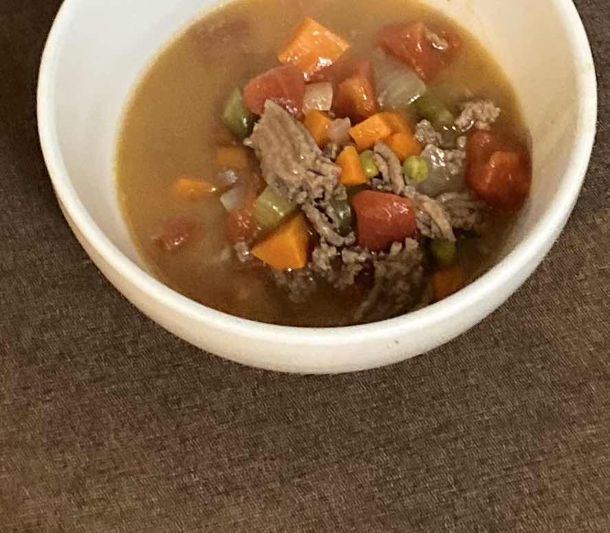 - Dump the meat, chopped veggies, frozen veggies and diced tomatoes into the broth mixture